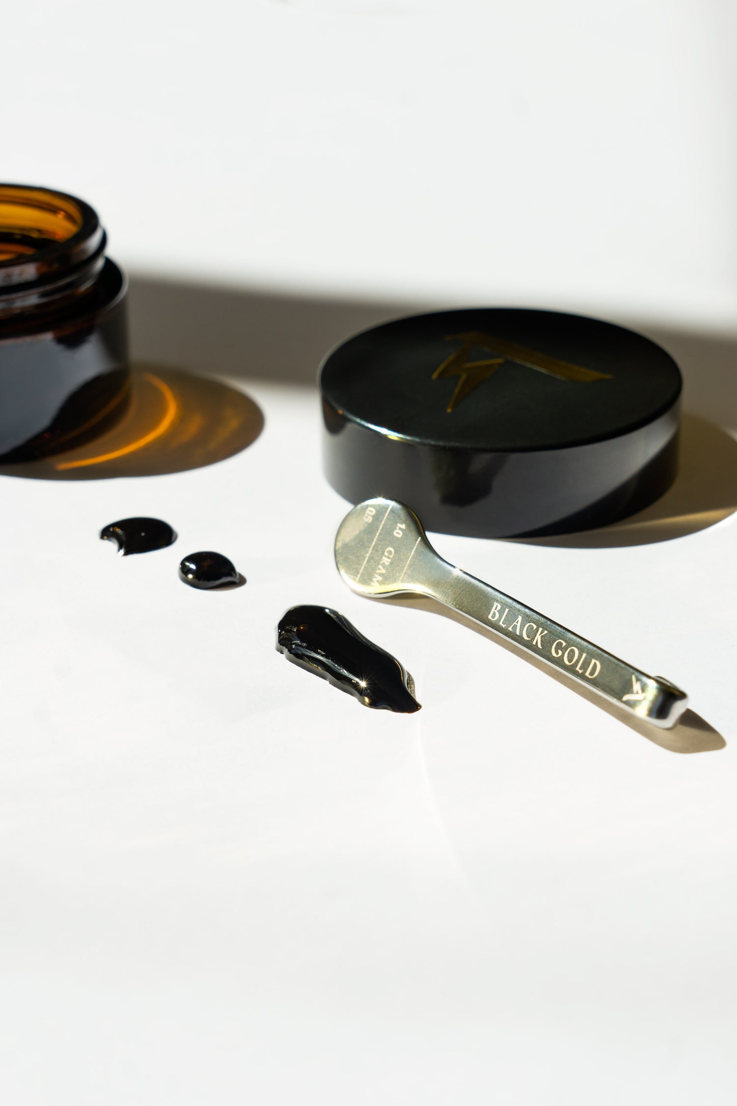 El shilajit se consume en forma de resina. Puede disolverse en agua tibia para tomarlo líquido o ingerirse directamente con la cuchara medidora BlackGold.